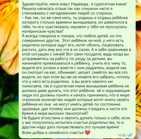 Здесь вы можете почитать отзывы суррогатных матерей, которые участвовали в программе заместительного вынашивания агентства СПАРТа. Это информация из первых рук. Мы надеемся, что она поможет вам составить объективное мнение о том, что собой представляет суррогатное материнство в целом и принять правильное решение о своей готовности помочь другим людям стать родителями.